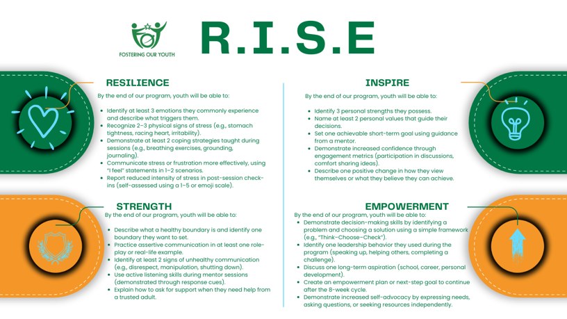 The FOY RISE Mentorship Program is an 8-week virtual experience that connects youth with trained mentors who provide support, guidance, encouragement, and a positive example.